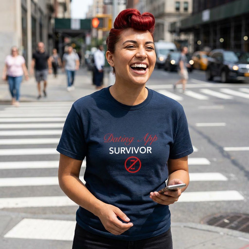 Wear this shirt like a badge of honor after swiping left through chaos. The crossed-out phone graphic and bold “Dating App Survivor” line land somewhere between wry and weary, a wink to late-night messages, ghosted chats, and awkward first dates that deserved better. Soft, durable cotton keeps the tee comfortable during post-date debriefs, bar trivia nights, or lazy weekends spent recharging. It’s the kind of shirt that starts a conversation without having to explain the whole story. Throw it on with jeans and your favorite jacket, and let the shirt do the small talk for you.