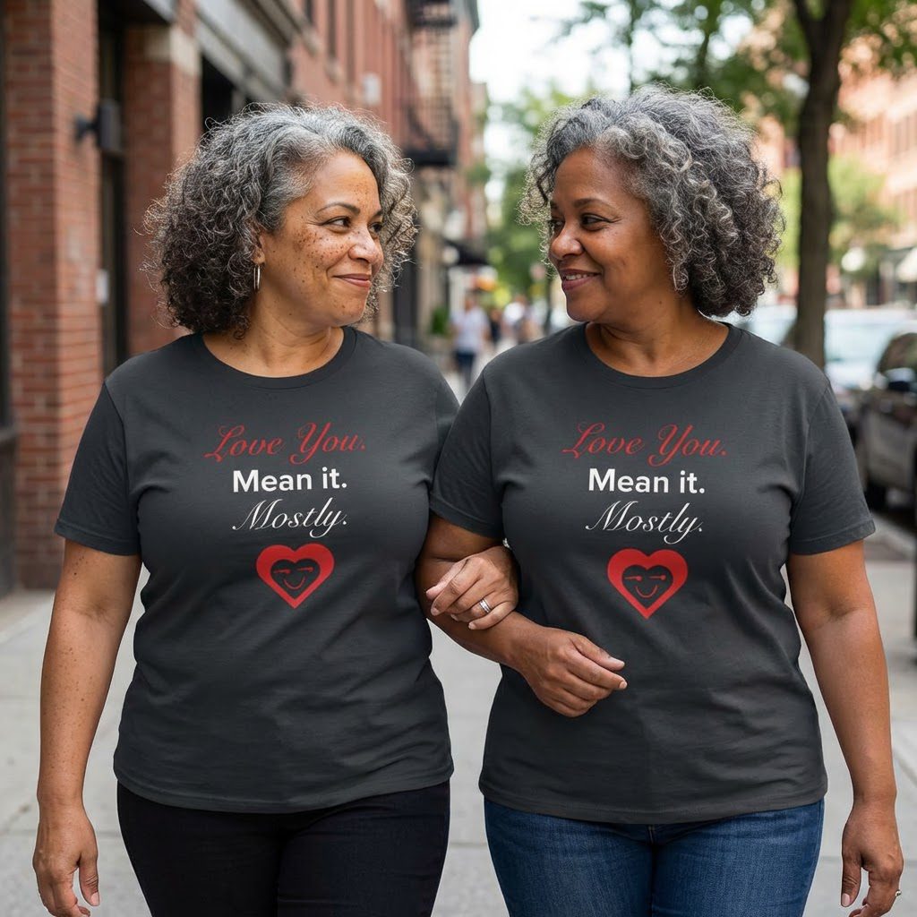 This tee speaks like someone who knows love is messy and hilarious. The design’s straight-talking line, “Love You. Mean It. Mostly.” lands as a wink between partners who trade sarcasm for deep affection. Soft cotton and a relaxed cut make it a go-to for slow mornings, running errands together, or cozying up on the couch during Valentine’s night in. Wear it to tell your person you’re devoted, even when you’re teasing. It sits comfortably in everyday life: layered under a flannel, paired with worn-in jeans, or tucked into pajama bottoms for a weekend of movies and takeout. The tone is playful, warm, and honest, exactly the kind of shirt that starts a laugh and ends with a hug.