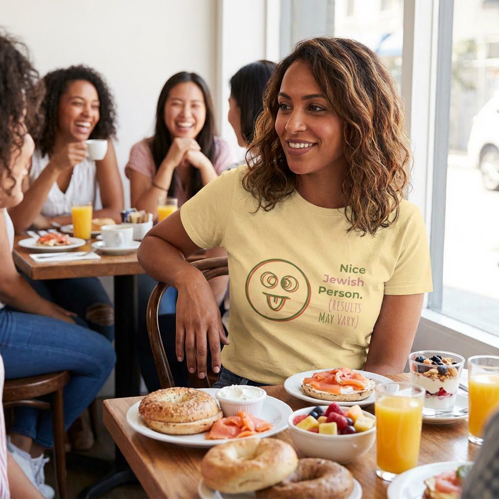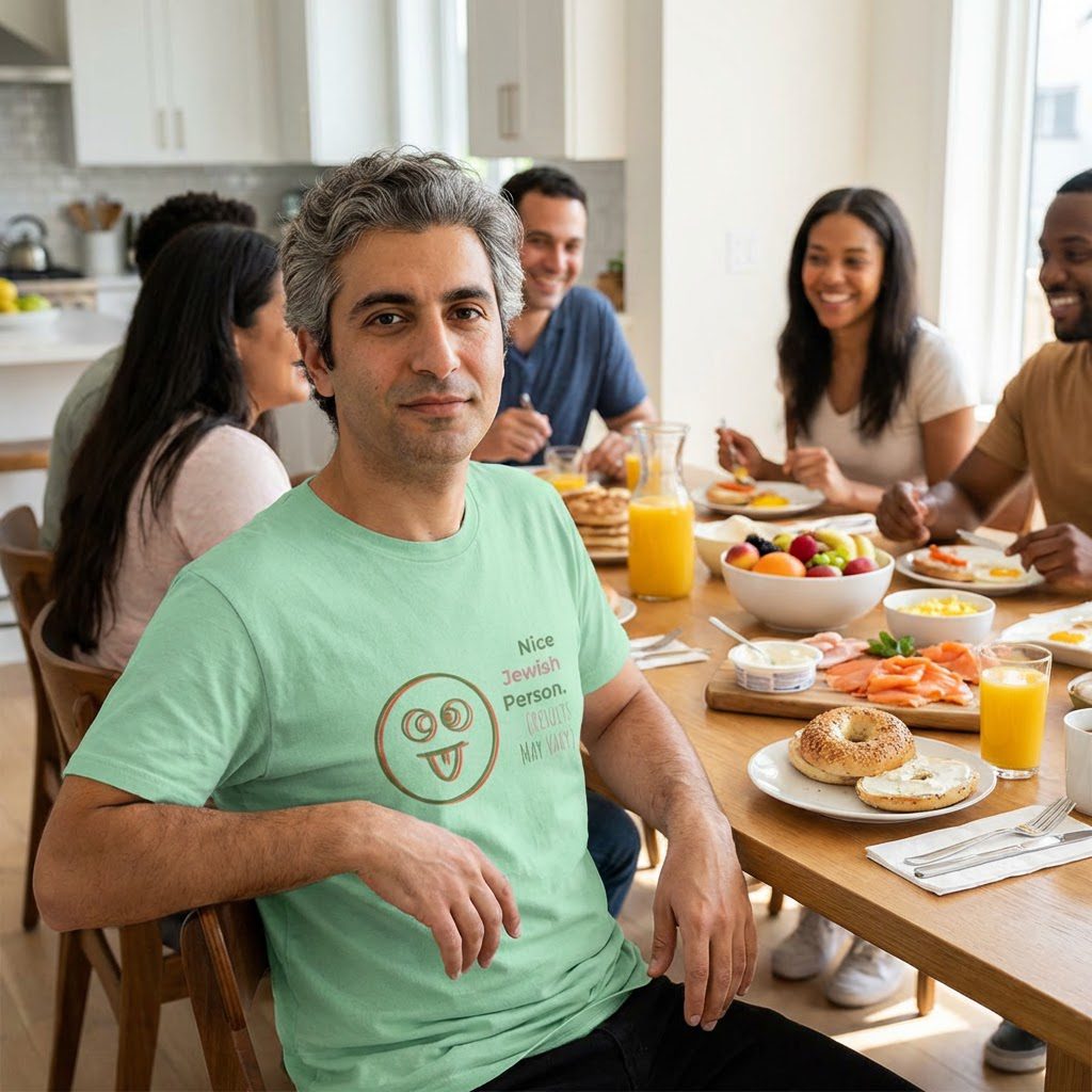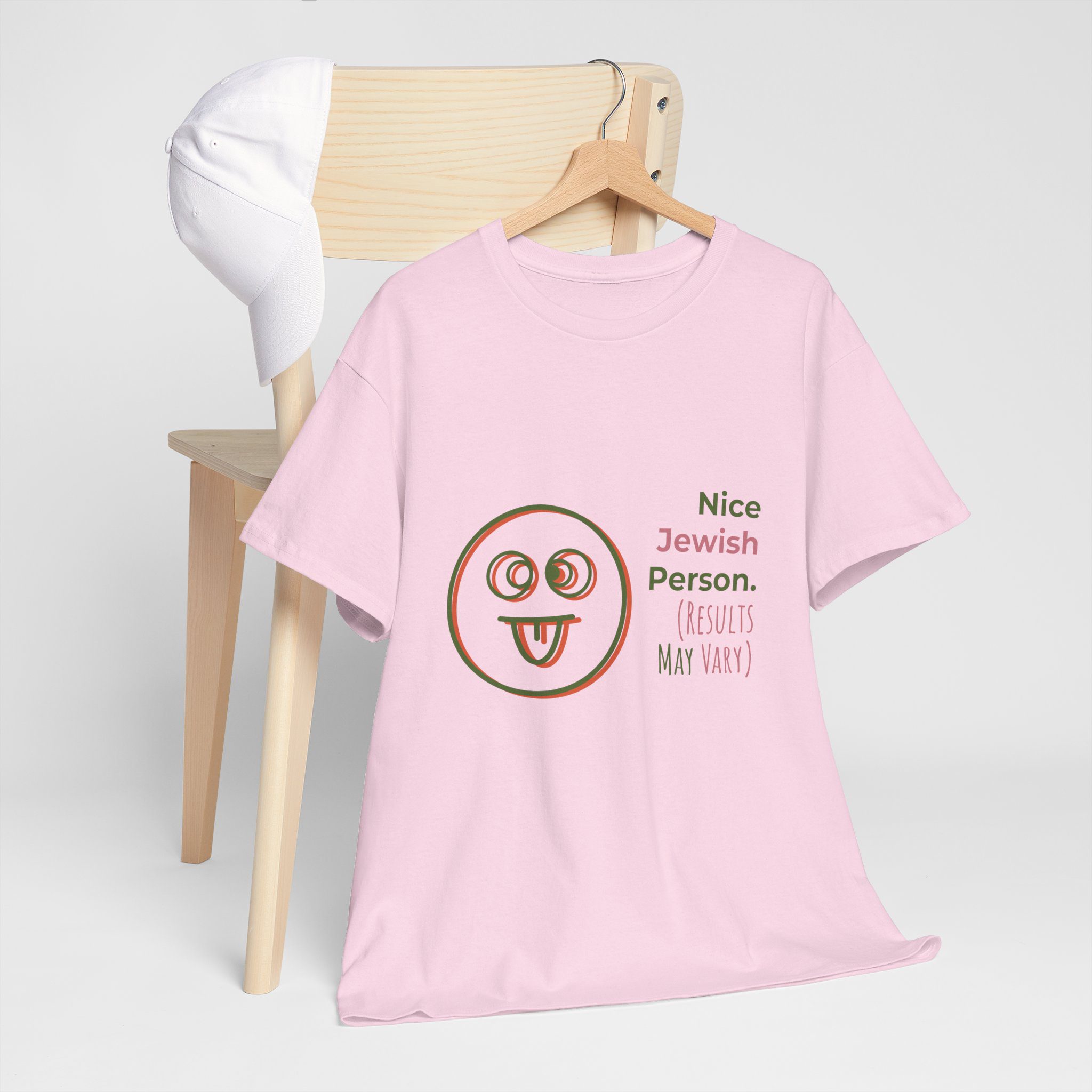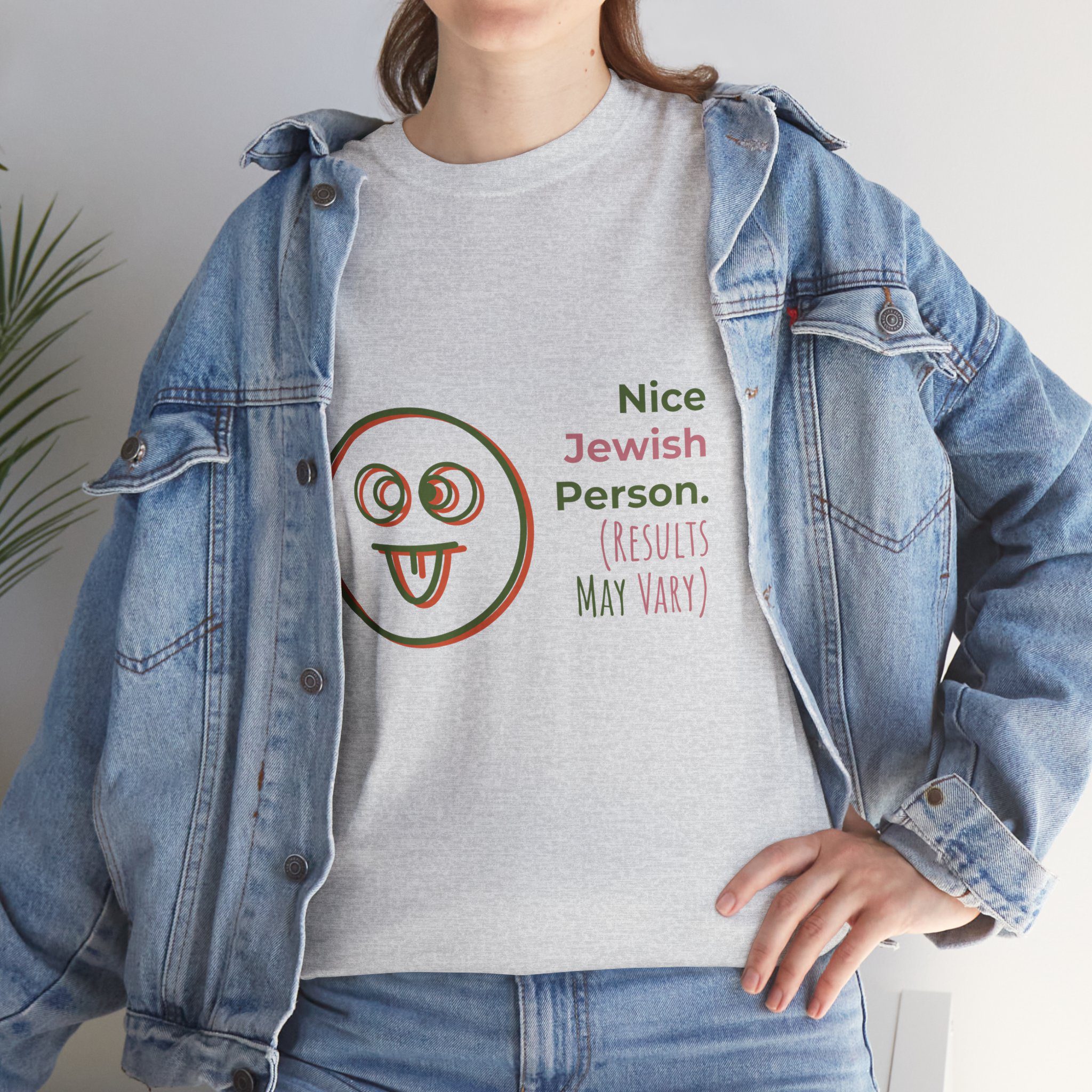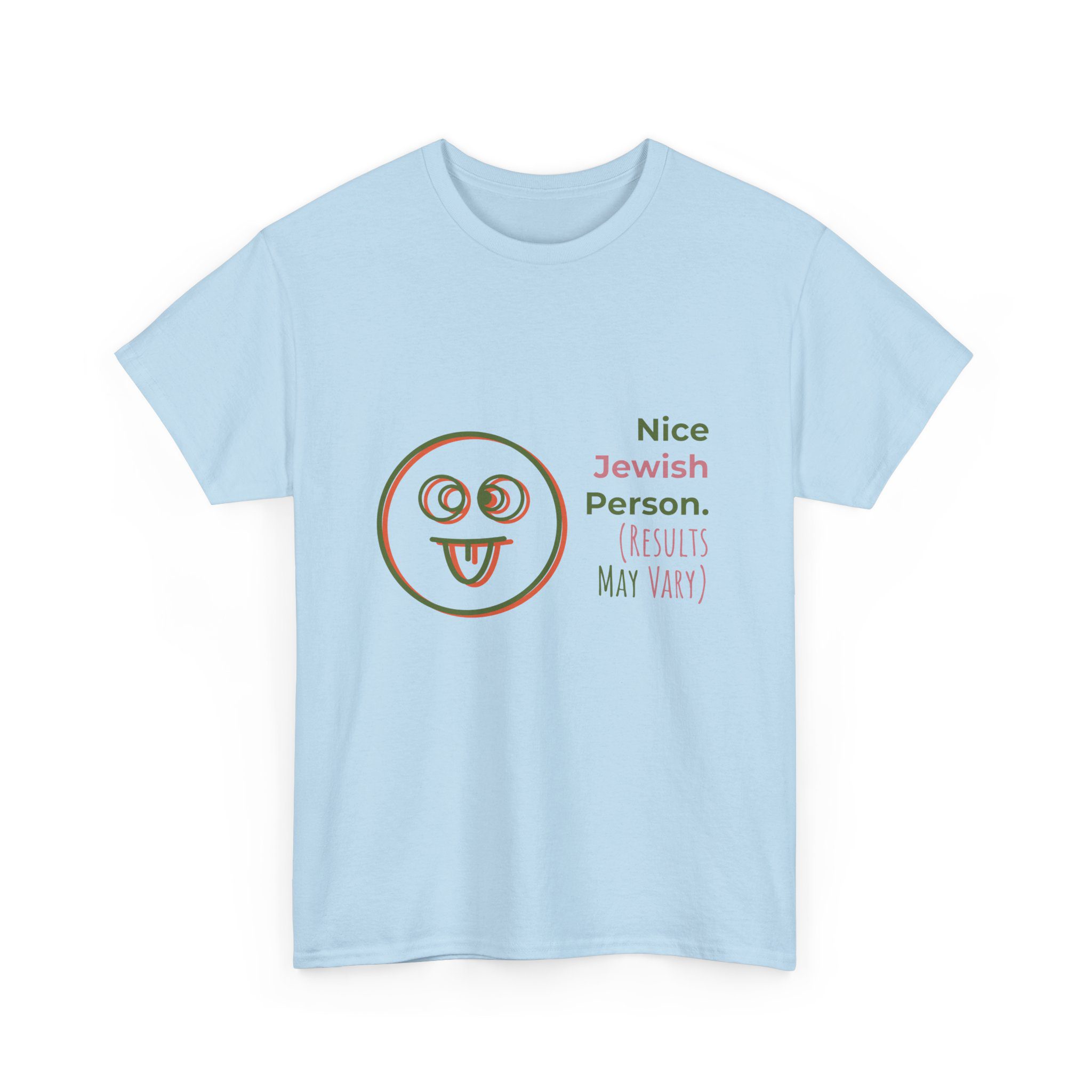 This sarcastic Jewish short sleeve tee is perfect for those looking to add a touch of humor to their wardrobe. With the phrase ‘Nice Jewish Person (Results may Vary)’, this tee is a funny gift. It is ideal for individuals with a playful sense of humor regarding their Judiasm.