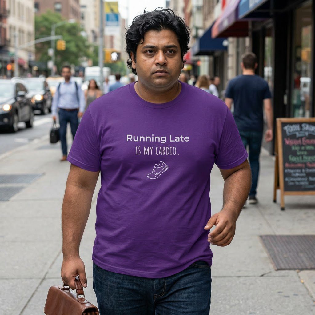 This “Running late is my cardio” graphic tee carries a wink of sarcasm that lands like a friend’s laugh the moment you pull it on. The shirt becomes part of the daily ritual: thrown on between coffee and keys, worn to commute chaos, or layered under a jacket for evenings out. It reads like a lived-in joke for people who move fast but don’t take themselves too seriously. Soft yet sturdy cotton holds the print crisp through washes, while the relaxed crew silhouette keeps you comfortable from errands to low-key meetups. Let this tee be the shorthand for your laid-back, slightly frantic rhythm, familiar, funny, and ready for the next five minutes of hustle.